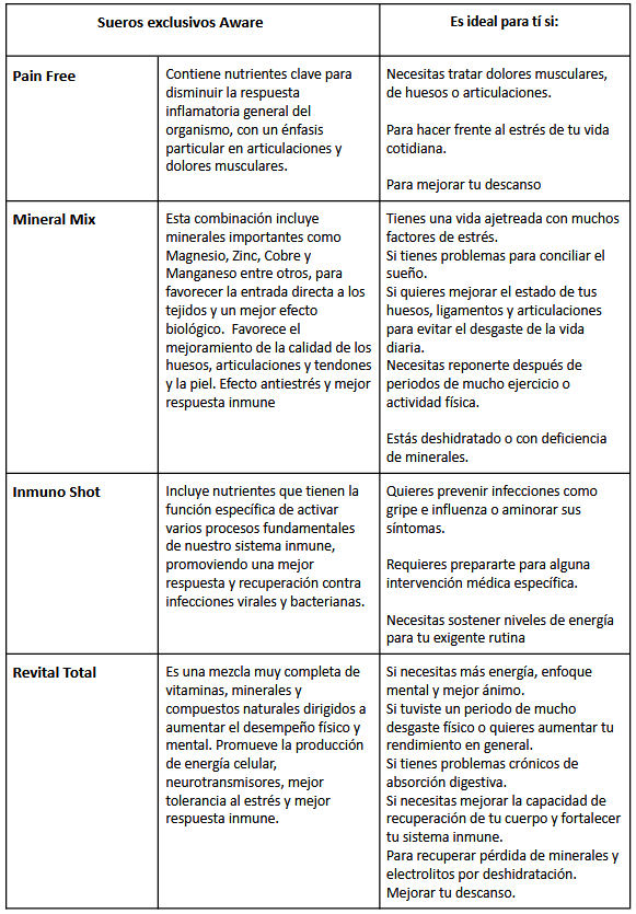 Todos nuestros sueros te ayudarán a sentirte revitalizado, con mayor energía y fortalecer tu sistema inmune porque los nutrientes llegan directamente al torrente sanguíneo. Y dependiendo de la fórmula de cada suero, se potenciarán algunos beneficios específicos. En la siguiente tabla, puedes ver información sobre cuales de estos sueros, pueden venir mejor para tí: